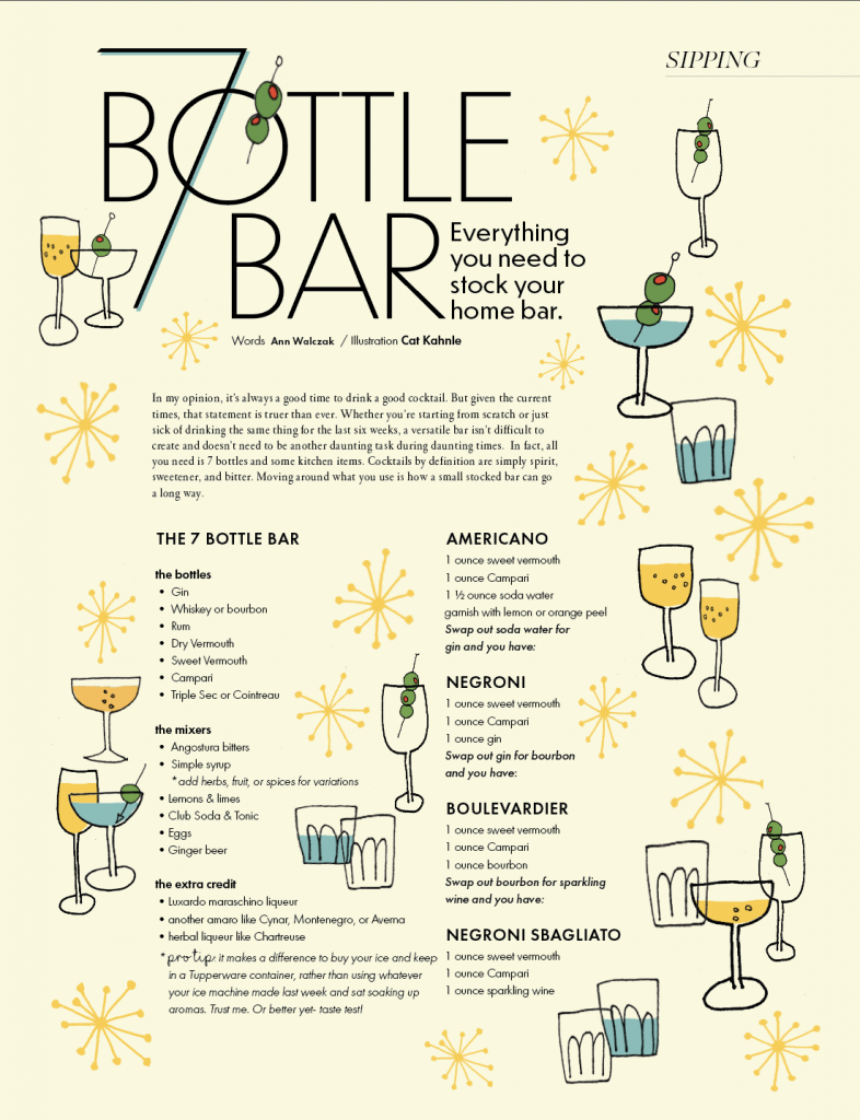 In my opinion, it’s always a good time to drink a good cocktail. But given the current times, that statement is truer than ever. Whether you’re starting from scratch or just sick of drinking the same thing for the last six weeks, a versatile bar isn’t difficult to create and doesn’t need to be another daunting task during daunting times. In fact, all you need is 7 bottles and some kitchen items. Cocktails by definition are simply spirit, sweetener, and bitter. Moving around what you use is how a small stocked bar can go a long way.
