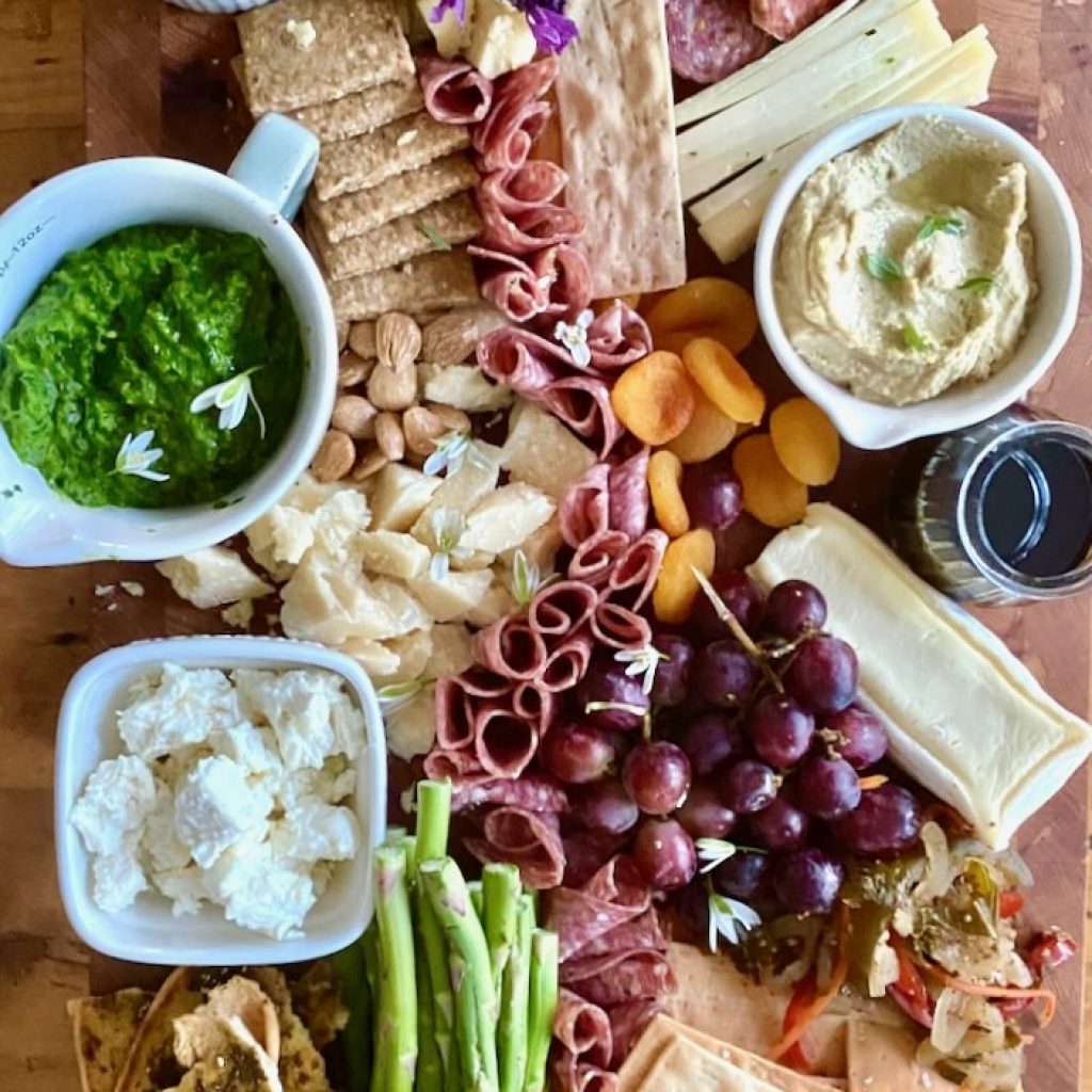 2. Intersperse dips and sauces with meats and cheeses. For spring we love strawberry jam, arugula pesto, and herby hummus interspersed with crunchy crackers, fresh soft pita, and sweet crisp carrots. Garlic White Bean Feta Dip is also a winner.