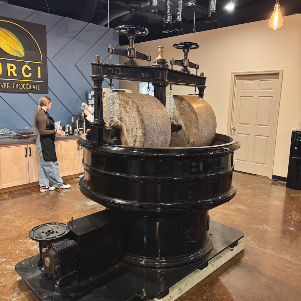 After they sold Crio Bru, they wanted to focus on bringing “bean to bar”chocolate to consumers and to focus on their love of making chocolate. In the process of sourcing cacao beans for the Crui Bru, they formed relationships with farmers and started buying direct (bypassing brokers) for their specialty small batch chocolate. They also formed a relationship with award winning chocolate maker Art Pollard, of Amano Chocolate, who helped shape Eric into the maker he is today. They had been making chocolate as early as 2016 and had won awards for their chocolate. In the spirit of marrying tradition with technology, Eric stone grinds 1000 pounds of beans at a time with a vintage machine that sits in the middle of the store.