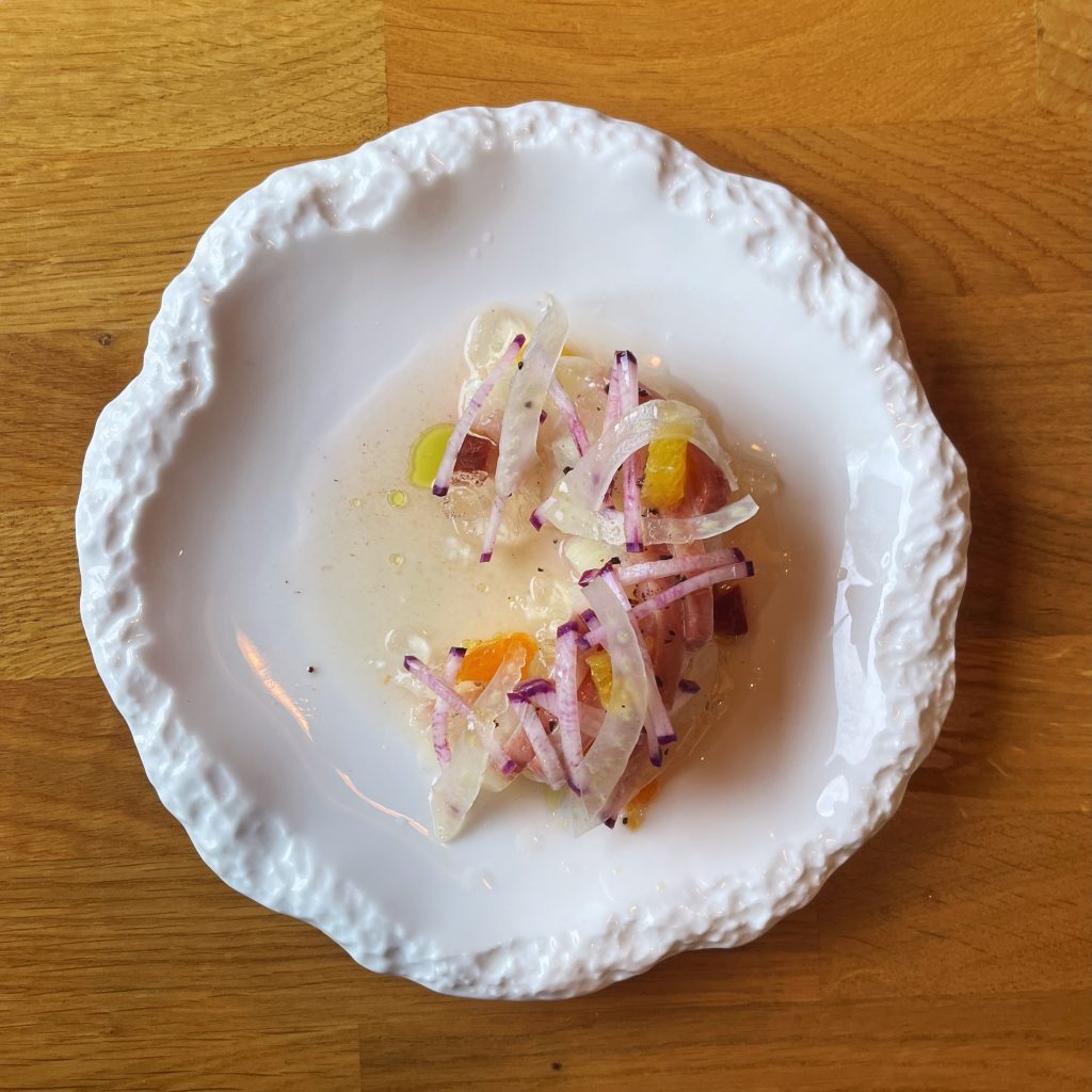 The first thing I notice upon entering Present Tense’s new location is the natural light that fills the dining room. As the sun sets, the lighting shifts to moody hues of red, accented by candle light. Soft, minimalist design touches every element of the izakaya style restaurant , from the 12-dish menu to the small team working closely together with care and knowledge to create a welcoming experience. Previously a 120-seat restaurant, the new location, on Houston Street in Wedgewood Houston, has scaled down to a 40-seat dining room. This includes a cozy bar where guests can watch executive chef and creative director, Ryan Costanza, and his team at work.