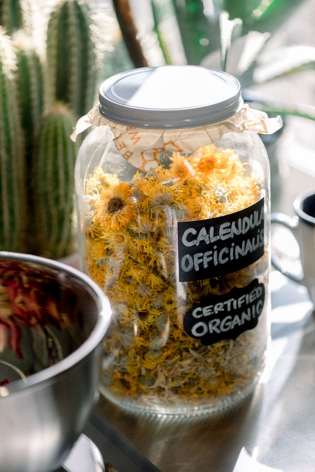 “Mom was a biochemist at Vandy working on her dissertation when I was young,” Erin says as she adds jojoba oil to some organic marigold blooms. “I would help her in the lab, but I didn’t get to do anything more interesting than pipetting 10 ml of water into a hundred different test tubes.”