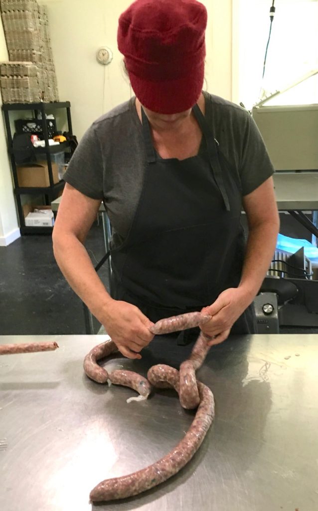 pigs, cattle, ducks, geese and guineas. Her pigs are called Mangalistas and are of Hungarian Royalty. They’re up to 70% fat and like the green beans, she found herself with massive amounts of pork fat without a market. She decided to make her own sausage and now has a new commercial kitchen on the farm where she can make and store her sausage. And her sausage is no ordinary sausage.