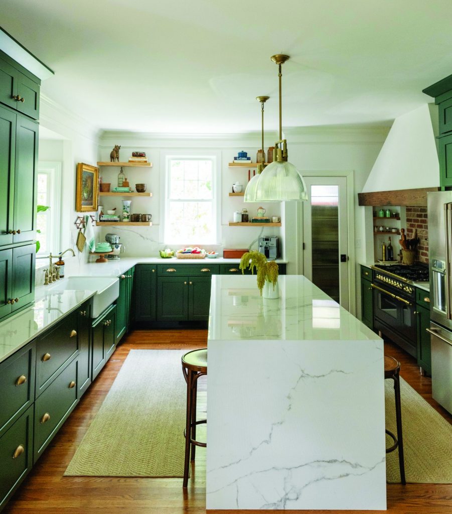 When Erin and Alfredo Malatesta renovated their ’90s home in the little enclave of Burwood in Thompsons Station, they chose green (specifically SW Roycroft Bottle Green). It’s Erin’s favorite color because it’s reminiscent of equestrian life and the Italian countryside. Both of which are important to the couple, on their homestead, replete with chickens and a substantial garden. The couple entertain and can vegetables, so the open design and large range are ideal.