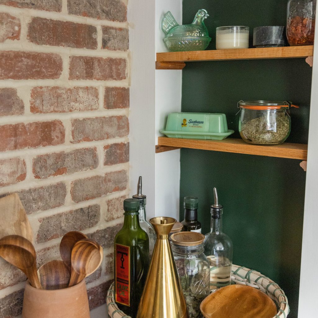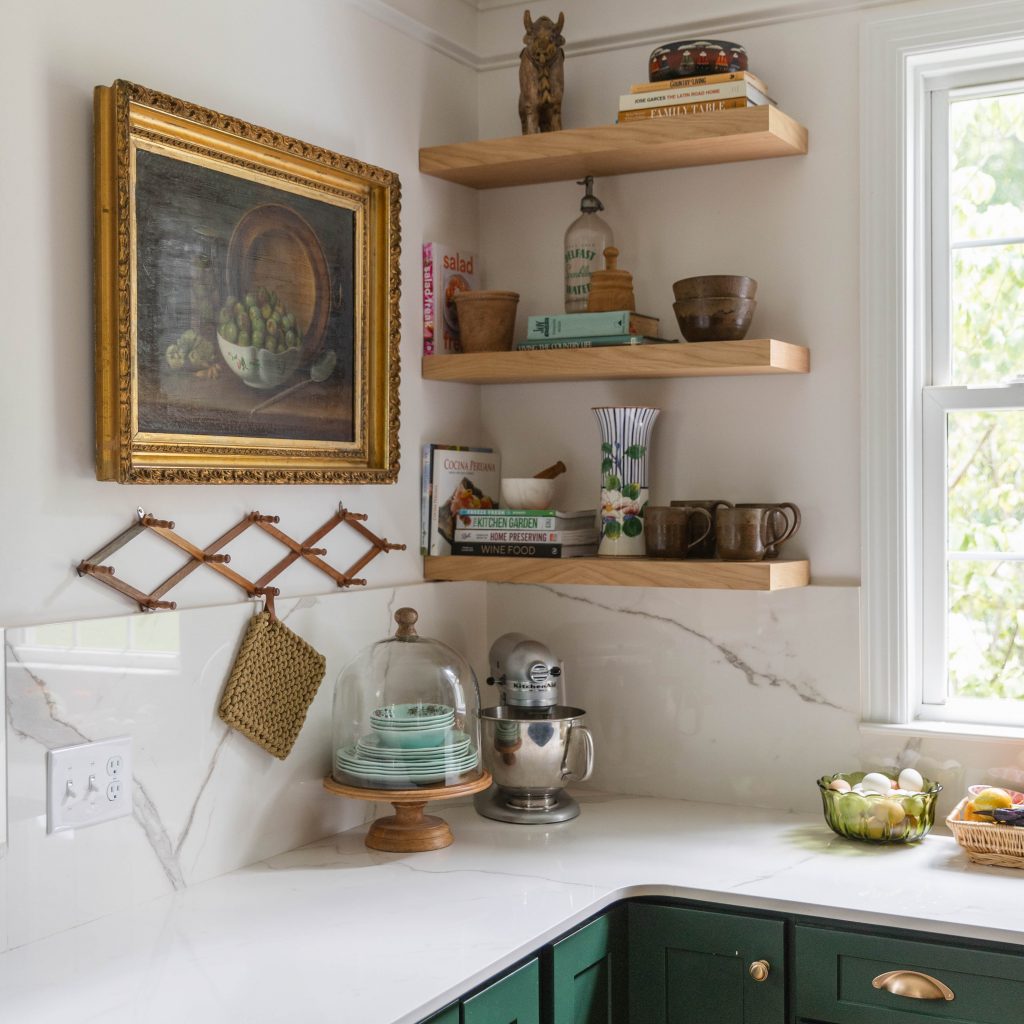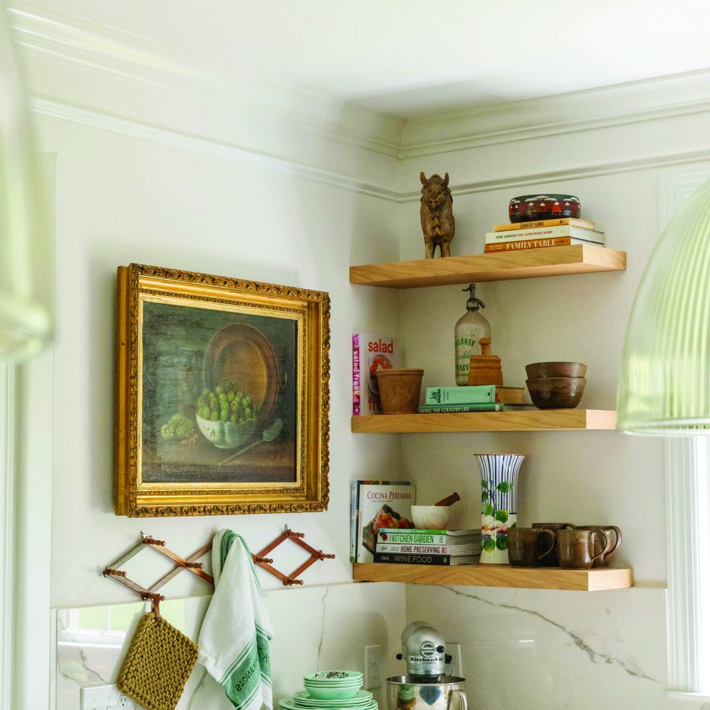 “We opted for open shelving to display cookbooks, easy-grab bowls and mugs and some fun trinkets.”