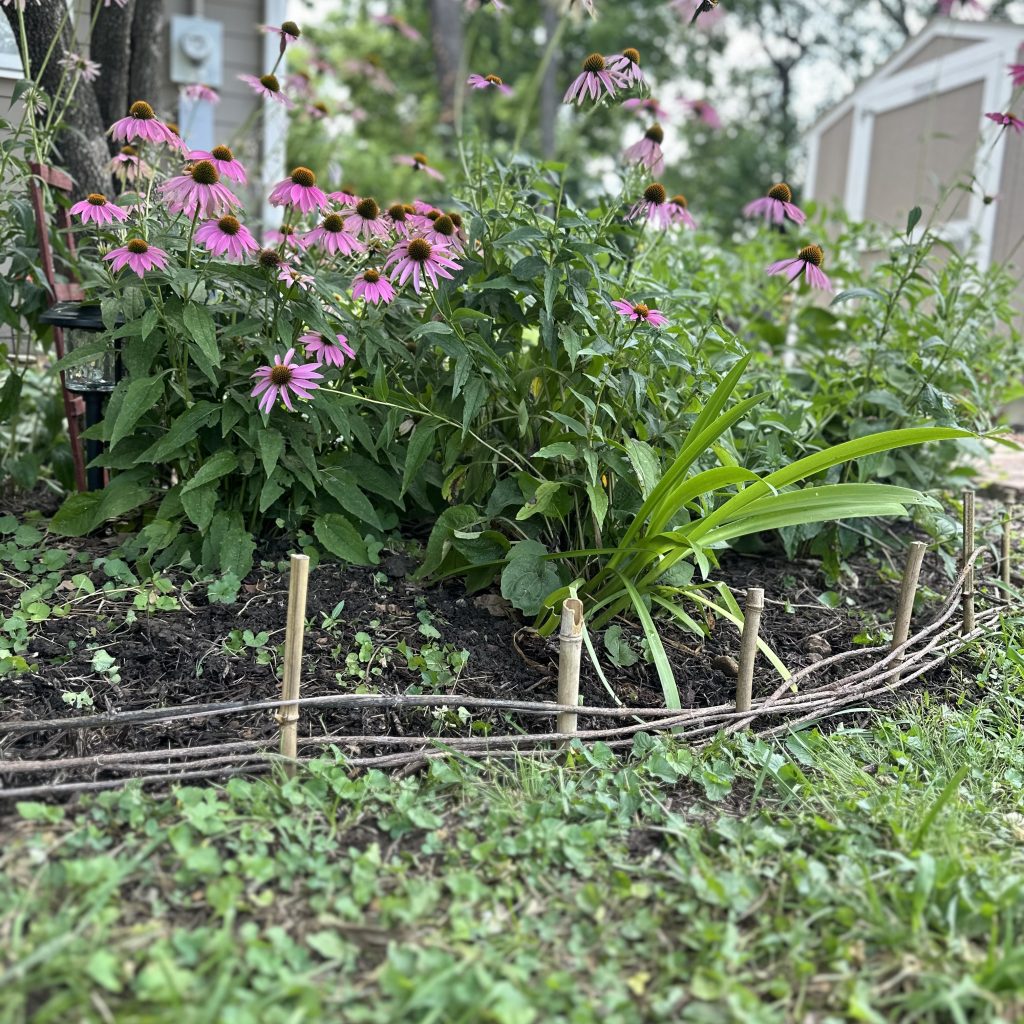 I fell for them for their organic looks, earthy appearance and natural origins. Saplings or thin branches ( vines are ideal) that can bend, are woven between pieces of stakes places in the ground. Mine is rather, uh, homely as I used what had on hand: pieces of dead bamboo growing in a neighbors yard and bendable twigs and branches I found basically anywhere. On my neighborhood walks, my yard or the park that I run in, that always has an abundance of trimming and wood laying about.