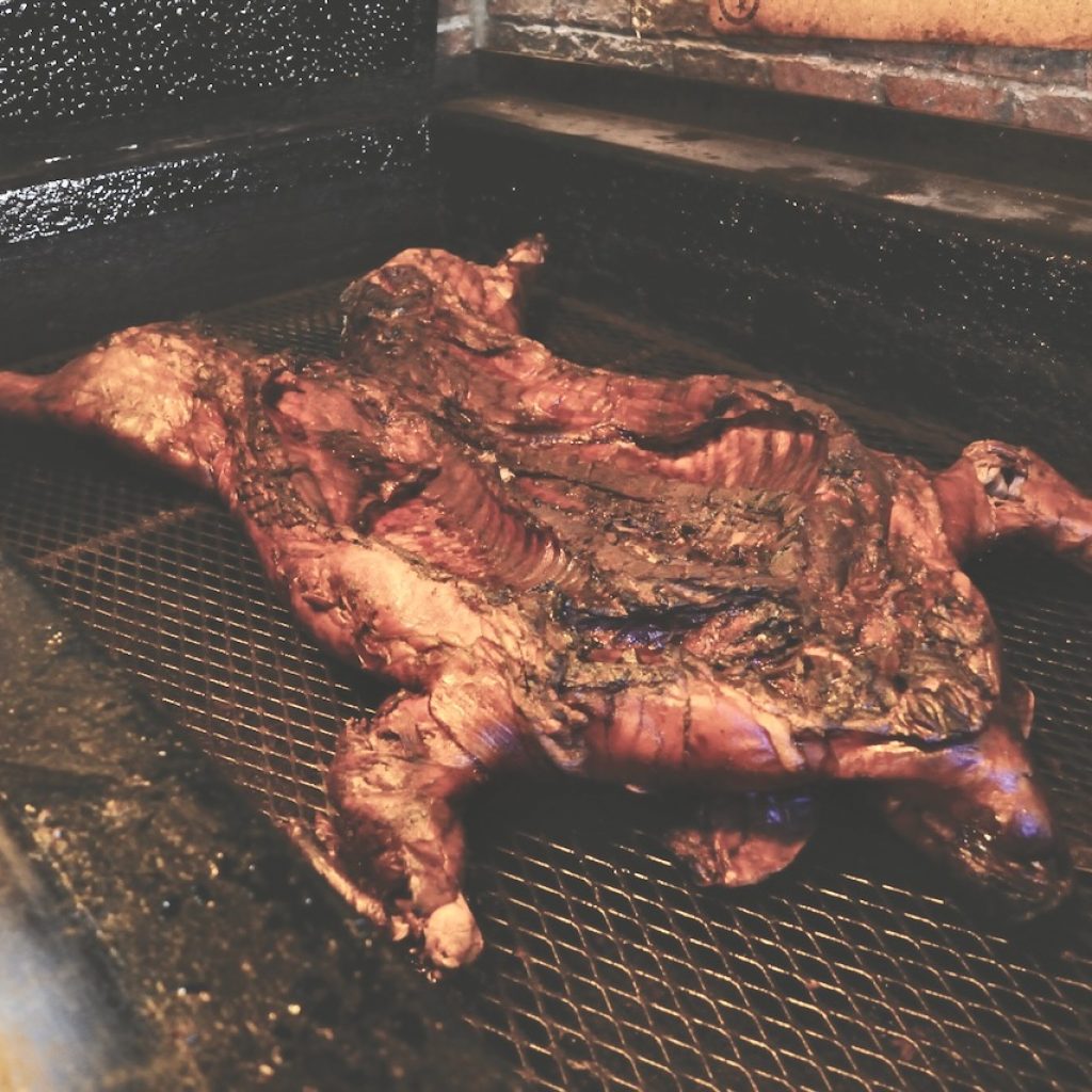 Those extremes include moving away from the modern gas-fired rotisserie smokers that are stashed in back of some barbecue joints that allow meat to be cooked low and slow with very little human interaction. Martin’s uses these “barbecuebots” as well, but Pat Martin is consciously moving back to the days of low-tech live fire cooking. Every Martin’s location is built around an open brick pit which brings diners closer to the experience of a whole hog cooking over smoldering wood and smoke.