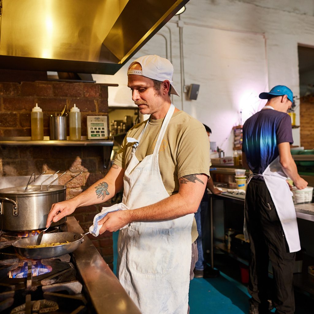 Writing the menu starts with a stroll through the larder to see what’s on hand at the end of the week. If it’s corn season, for example, expect variations on corn—maybe grilled cob cross sections and a setup of corn, cucumber, cherry tomatoes and jalapeño mayonnaise with grilled octopus. Or if a farm has a small harvest of an intriguing ingredient that’s not enough volume to sustain an actual ongoing menu feature, Sunday is a moment to experiment with it.