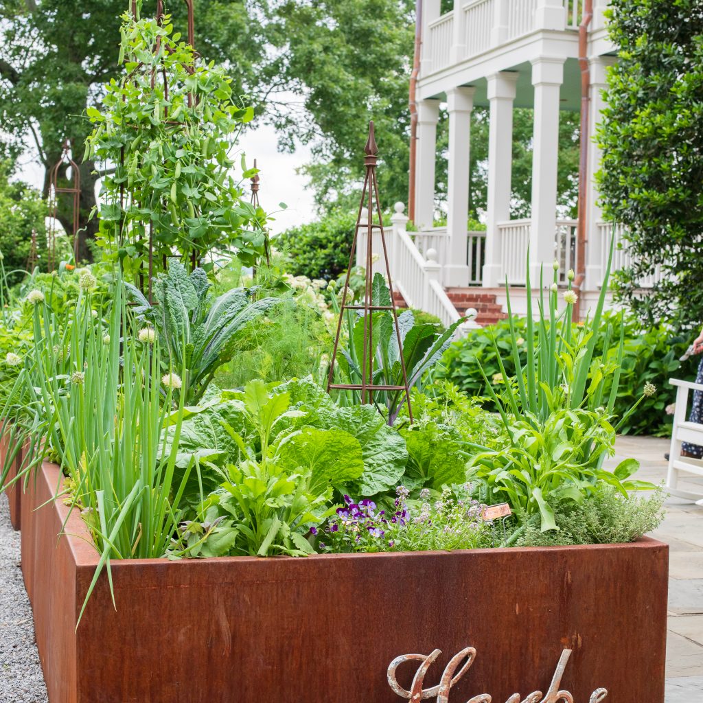 “We design beds for three seasons,” Sarah says, explaining the rotation of crops from cool-weather herbs into warm-season tomatoes and peppers, followed by cool-season cabbage, lettuce, kale, radish and carrots.
