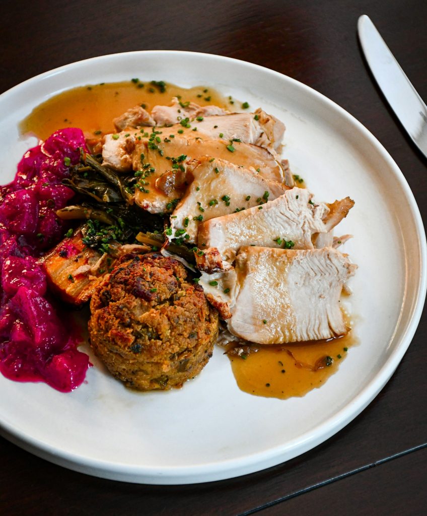 The meal begins with house-made Focaccia served with Olive Butter, followed by Executive Chef Andrew Rodriguez’s prix fixe menu, featuring standout dishes such as Black Truffle Arancini, Spiced Lamb Meatballs, Charred Pumpkin Soup, Black Garlic Short Rib, Caramelized Cabbage, Wood-Fired Trout, Chicken Tagine, and Bavette. A traditional Maple-Glazed Turkey Dinner with Chorizo & Calabrian Chili Stuffing, Pommes Purée, Green Bean Casserole, and Orange Cranberry Relish rounds out the menu, all finished with decadent desserts.