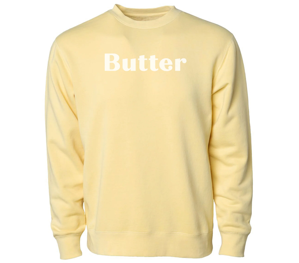 The BUTTER Unisex Sweatshirt by Flavour Gallery is a pigment-washed, extra-soft cotton/fleece blend with a roomy fit. Perfect companion for cozy baking sessions, farmers market trips and layering during any season. Designed and printed in Tennessee. Flavour Gallery, @flavourgallery