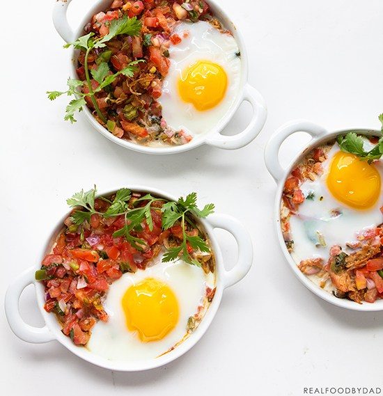 2. Evenly divide the shredded chicken between four ramekins. Evenly divide 3/4 cup of Ousley Ouch salsa between the ramekins. Gently crack an egg in each ramekin