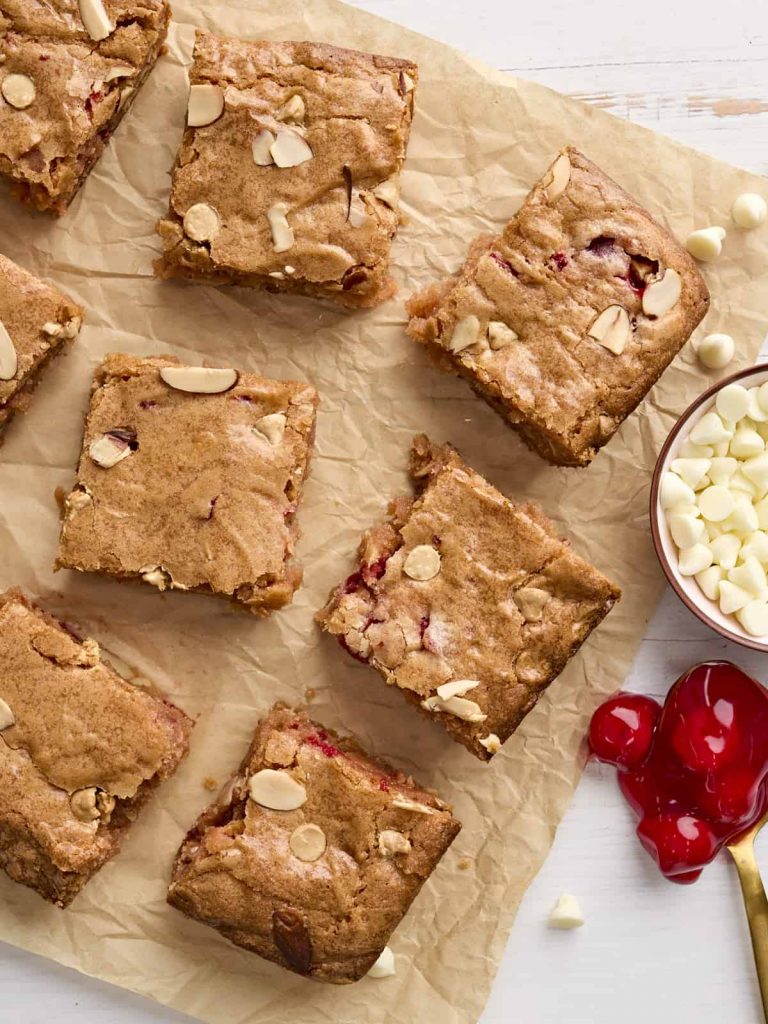 Fall in love with these fudgy, chewy Cherry Blondies. Fragrant, buttery, and studded with creamy white chocolate, tart cherries, and crunchy almonds, they’re sweet, a little flirty, and definitely not your typical blondie.