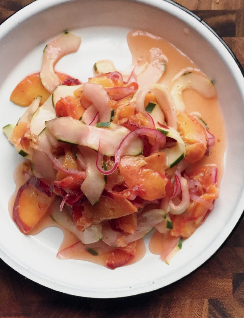 1. Peel cucumber if desired. Half and seed. Slice cucumber into thin slices (or get thin strips with a potato peeler) and place in a bowl. Half the peaches, remove the pit and slice into ¼ inch slices. Add the sliced peaches, onion and salt to the bowl; toss to combine. Set aside.