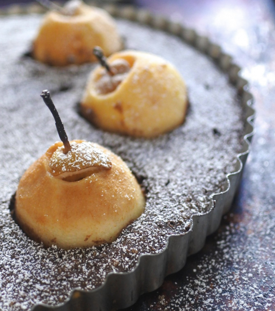 4. With a spoon, remove a small circle from the center of each cake. Take out just enough cake for your pear to rest comfortably on top. Place each cake on a serving plate. Gently set a poached pear into the center. Pour Maple Cream Sauce over the pear and sprinkle with cinnamon and/or nutmeg.