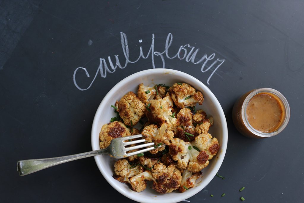 2. Break cauliflower into small florets. Place on baking sheet and toss with olive oil and salt. Roast at 400F for 35 minutes or until browned and tender, turning occasionally. Toss cauliflower with a little dressing.